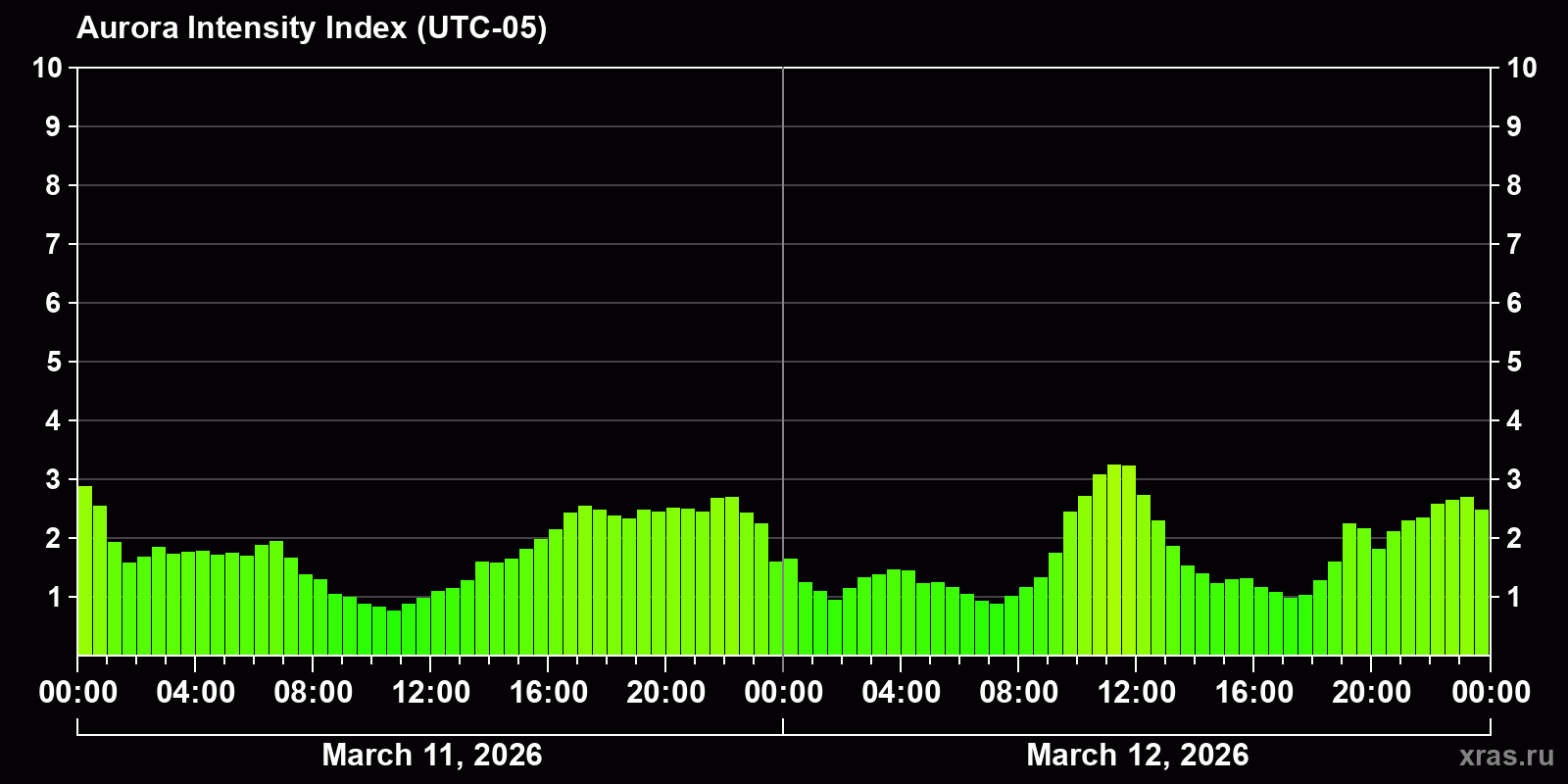 Auroral intensity index and the theoretically possible latitude of observations for nighttime in the Western Hemisphere as of 2026-03-12 23:47 (end of day) local time
