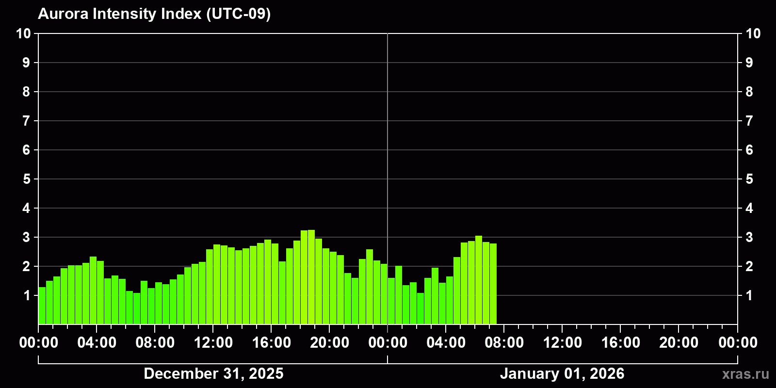 Auroral intensity index and the theoretically possible latitude of observations for nighttime in the Western Hemisphere as of 2026-01-01 05:20 (end of day) local time