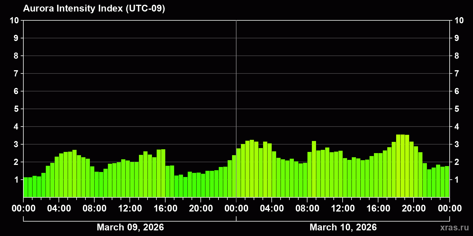 Changes in the auroral intensity index from 2026-03-09 to 2026-03-10 local time