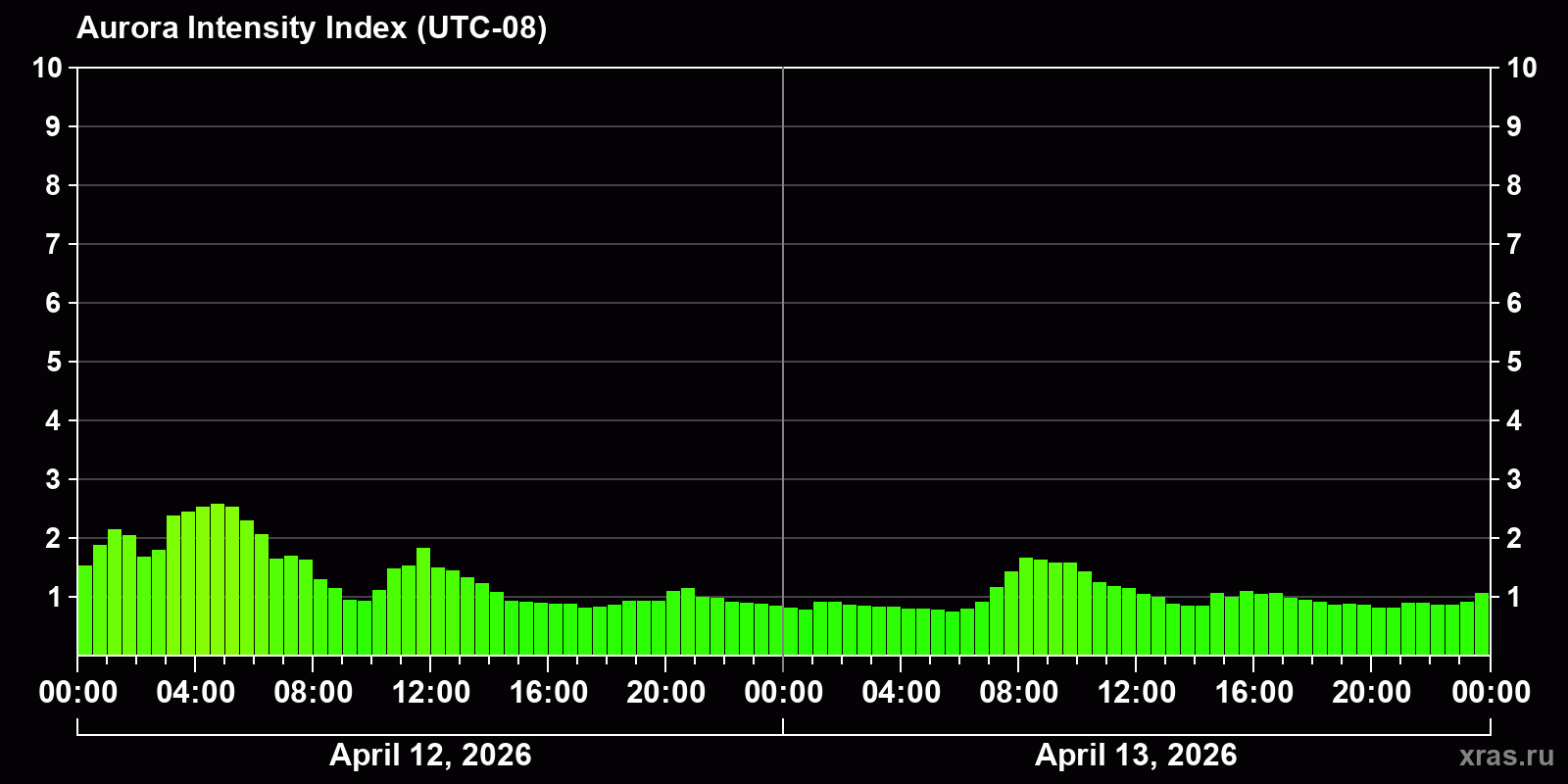 Changes in the auroral intensity index from 2026-04-12 to 2026-04-13 local time