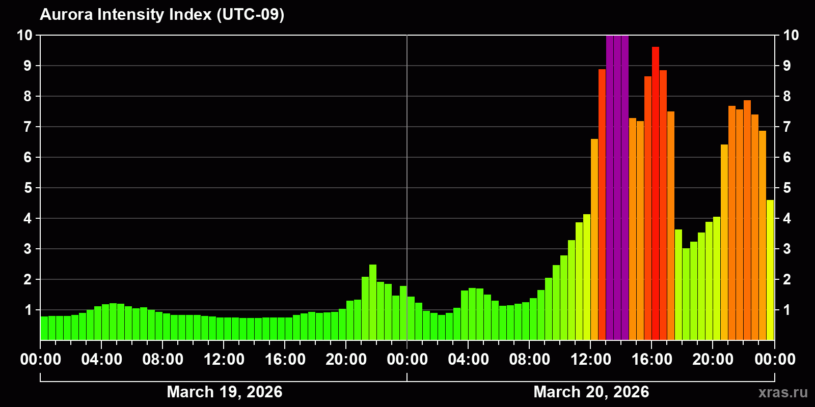 Changes in the auroral intensity index from 2026-03-19 to 2026-03-20 local time