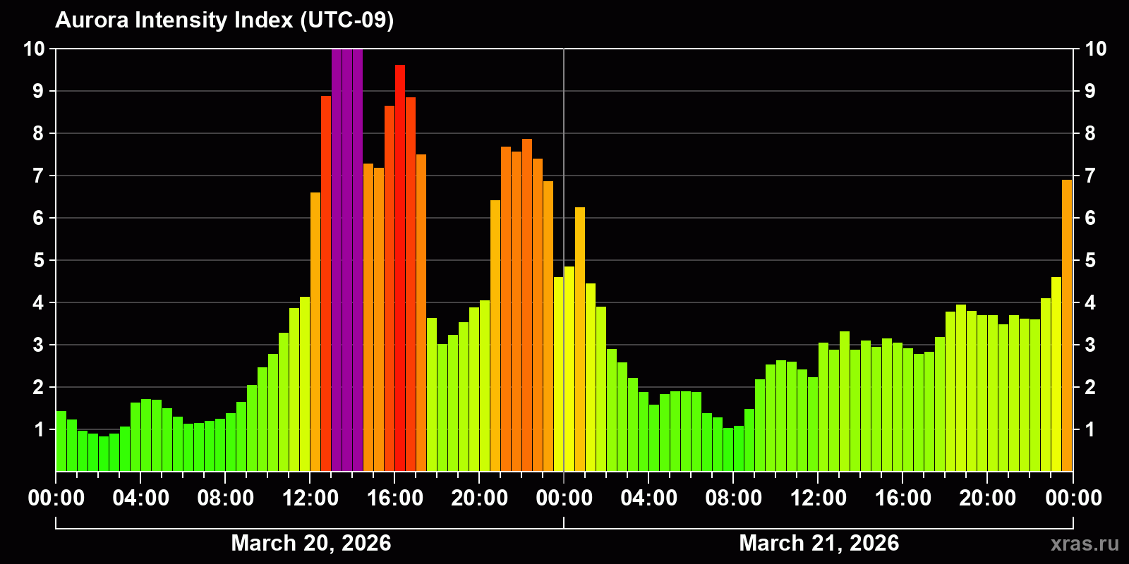Changes in the auroral intensity index from 2026-03-20 to 2026-03-21 local time