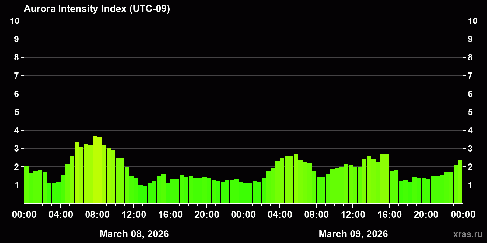 Changes in the auroral intensity index from 2026-03-08 to 2026-03-09 local time