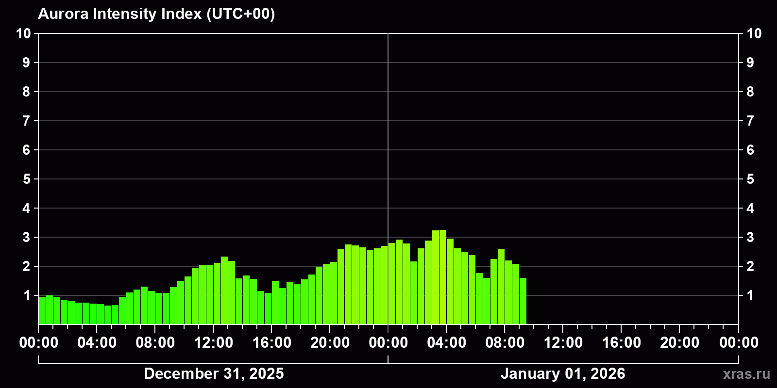 Auroral intensity index and the theoretically possible latitude of observations for nighttime in the Estern Hemisphere as of 2026-01-01 07:43 (end of day) local time