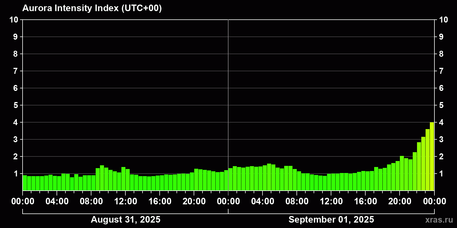 Auroral intensity index and the theoretically possible latitude of observations for nighttime in the Estern Hemisphere as of 2025-09-01 23:53 (end of day) local time