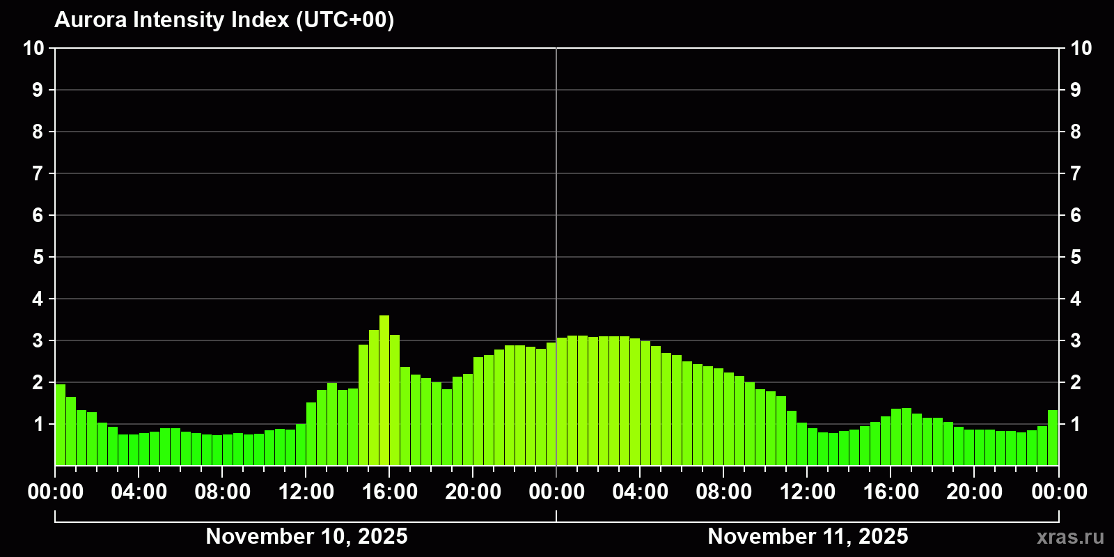 Changes in the auroral intensity index from 2025-11-10 to 2025-11-11 local time