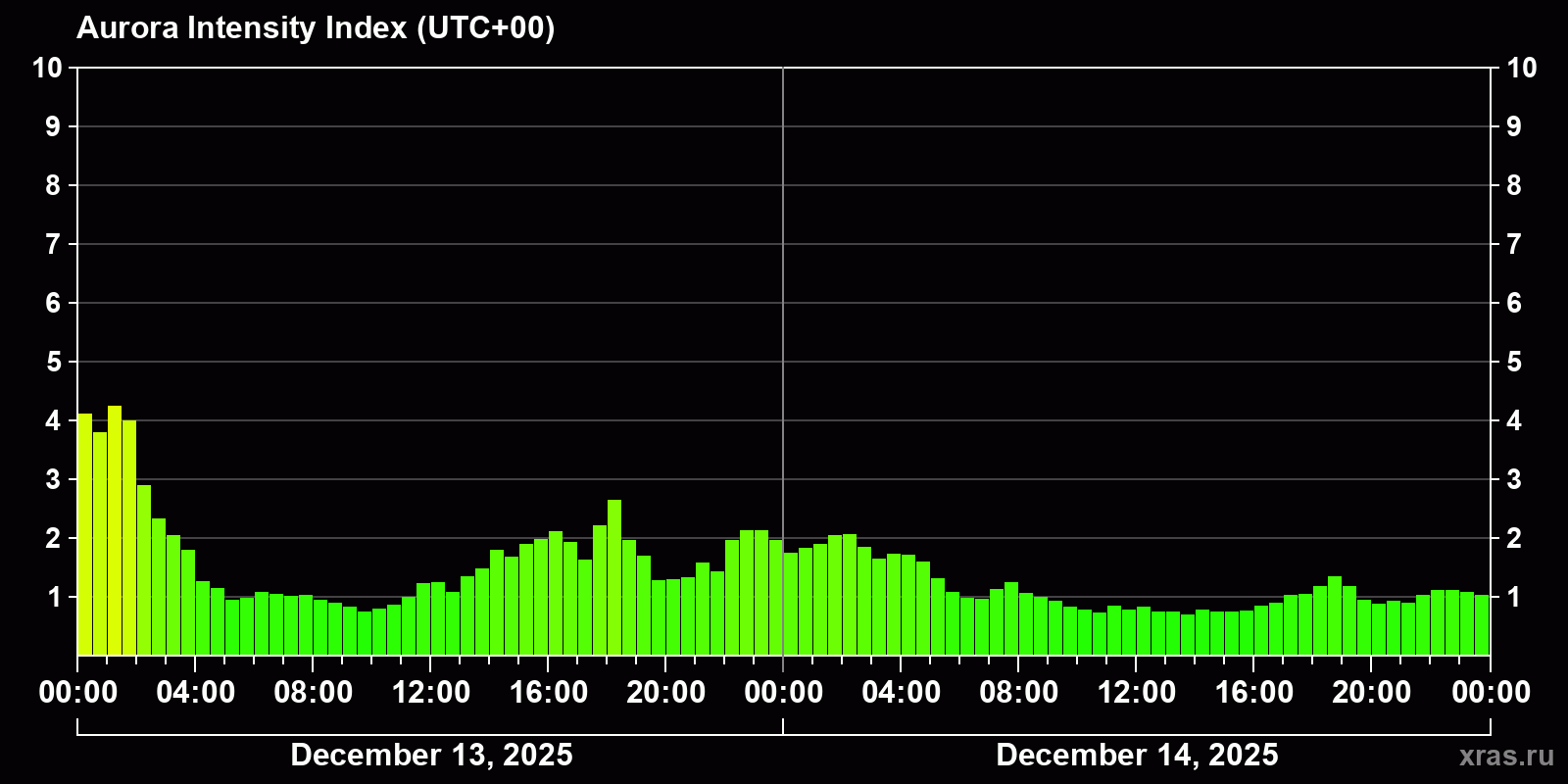 Auroral intensity index and the theoretically possible latitude of observations for nighttime in the Estern Hemisphere as of 2025-12-14 23:55 (end of day) local time