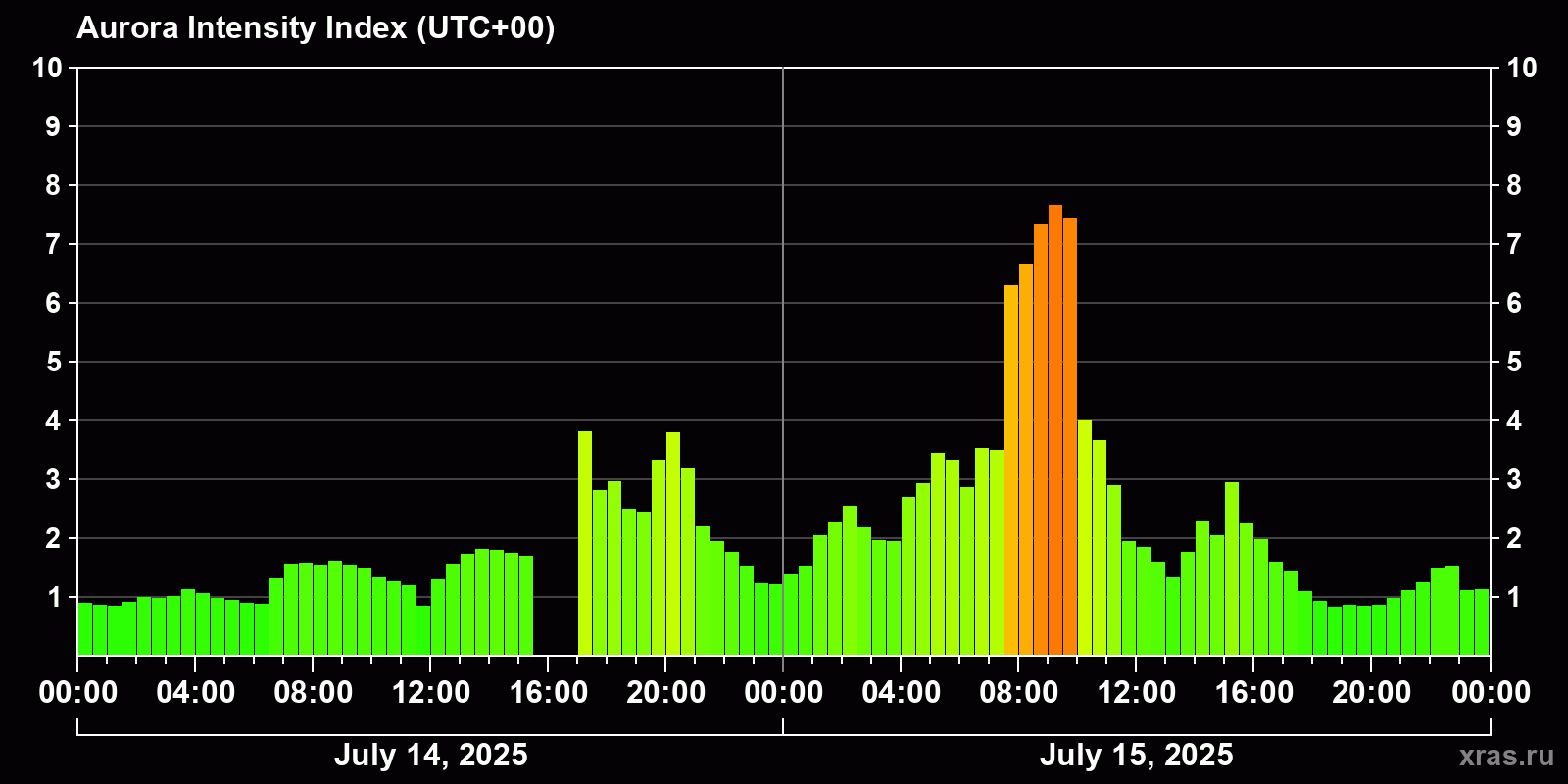 Changes in the auroral intensity index from 2025-07-15 to 2025-07-16 local time