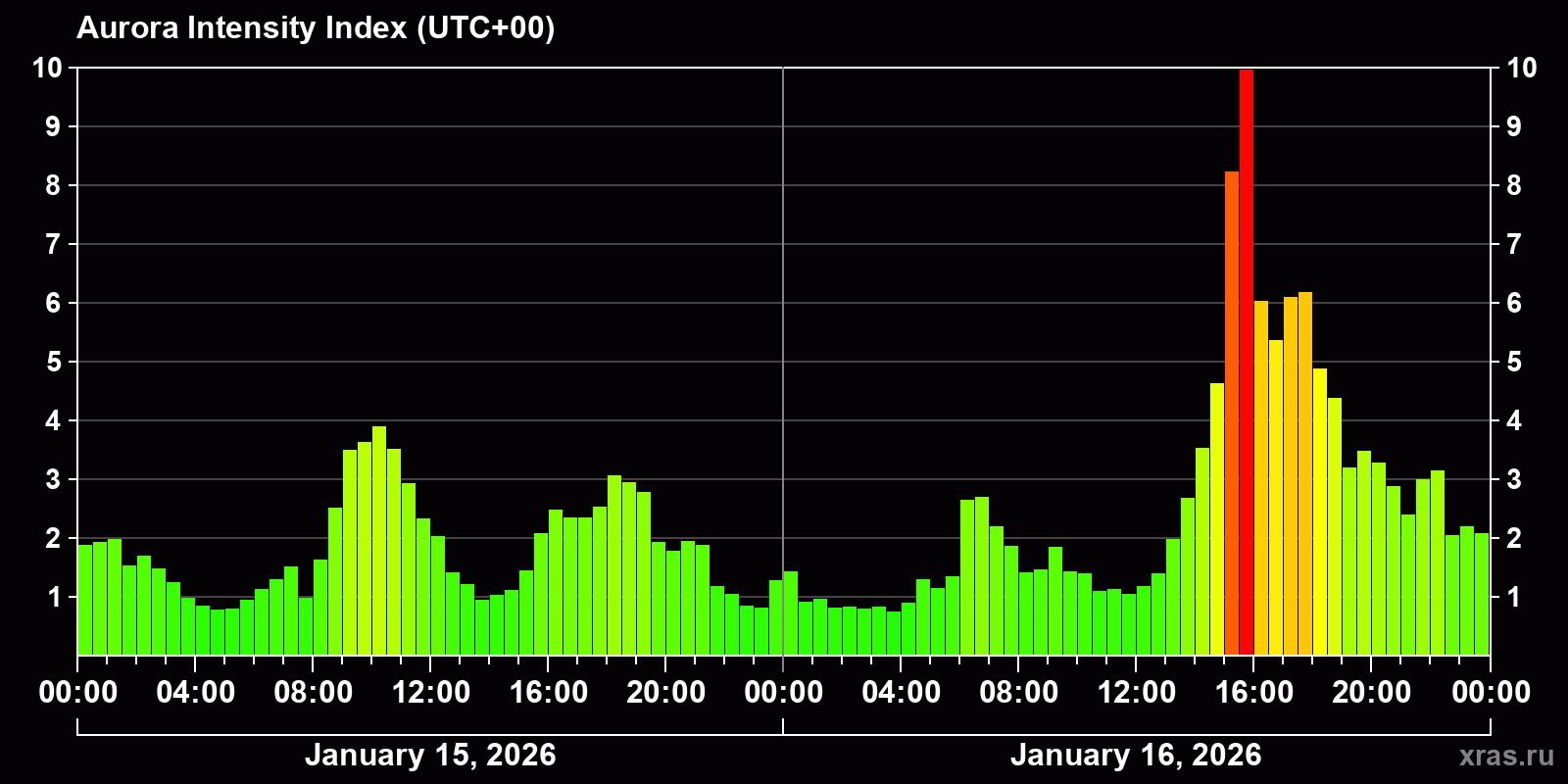 Changes in the auroral intensity index from 2026-01-15 to 2026-01-16 local time