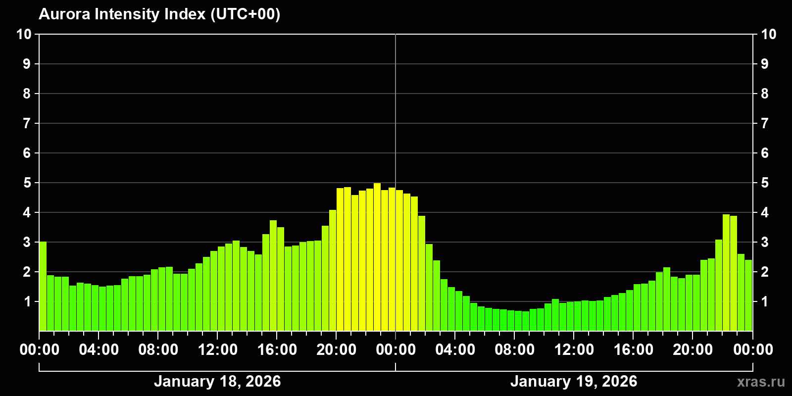 Auroral intensity index and the theoretically possible latitude of observations for nighttime in the Estern Hemisphere as of 2026-01-19 23:55 (end of day) local time