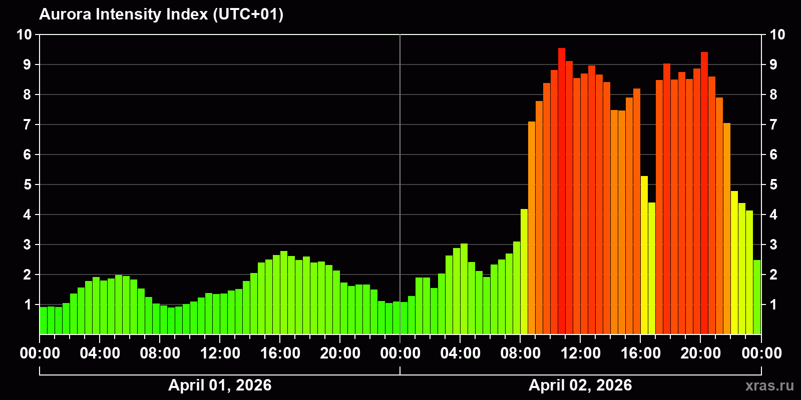 Changes in the auroral intensity index from 2026-04-01 to 2026-04-02 local time