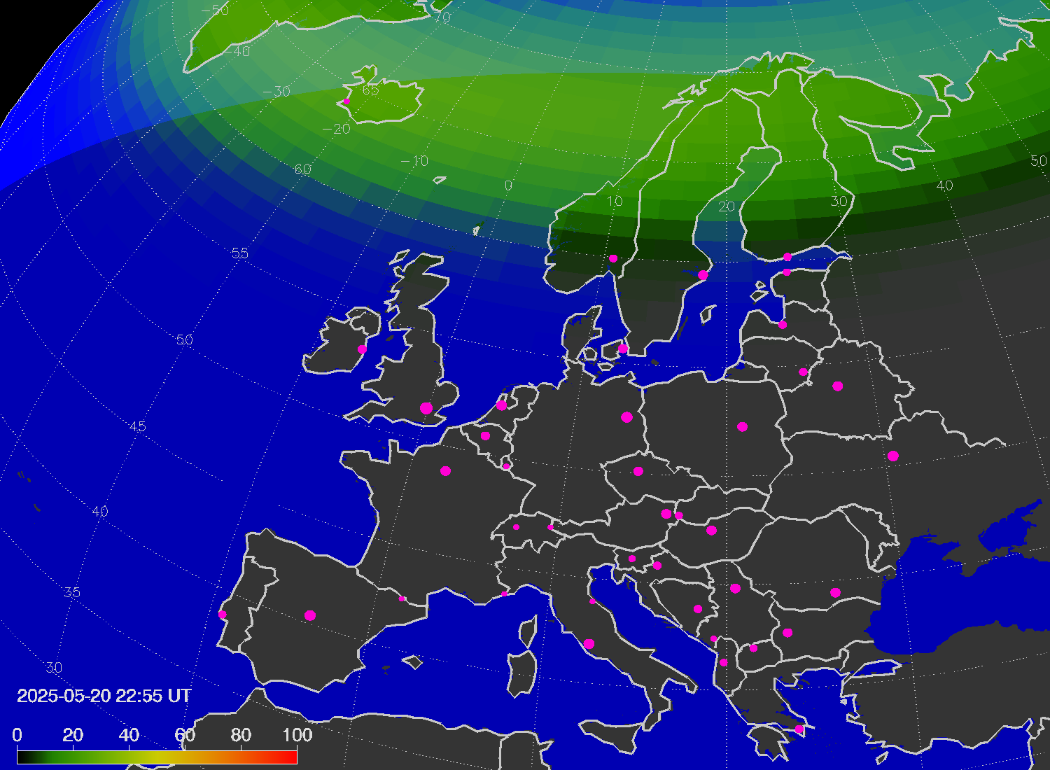 Probability of northern lights (auroras) in cities of Europe
