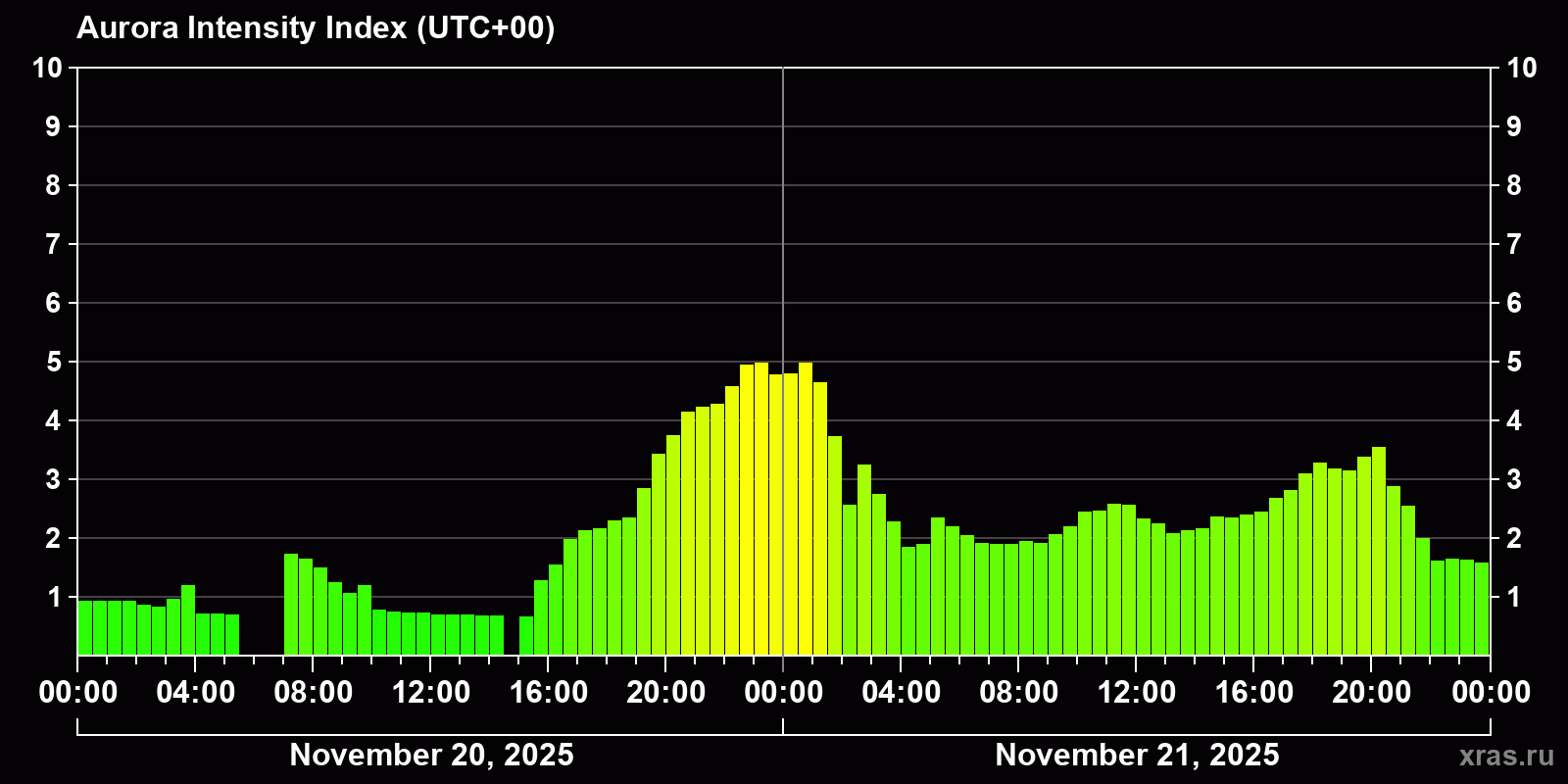 Auroral intensity index and the theoretically possible latitude of observations for nighttime in the Estern Hemisphere as of 2025-11-21 23:45 (end of day) local time