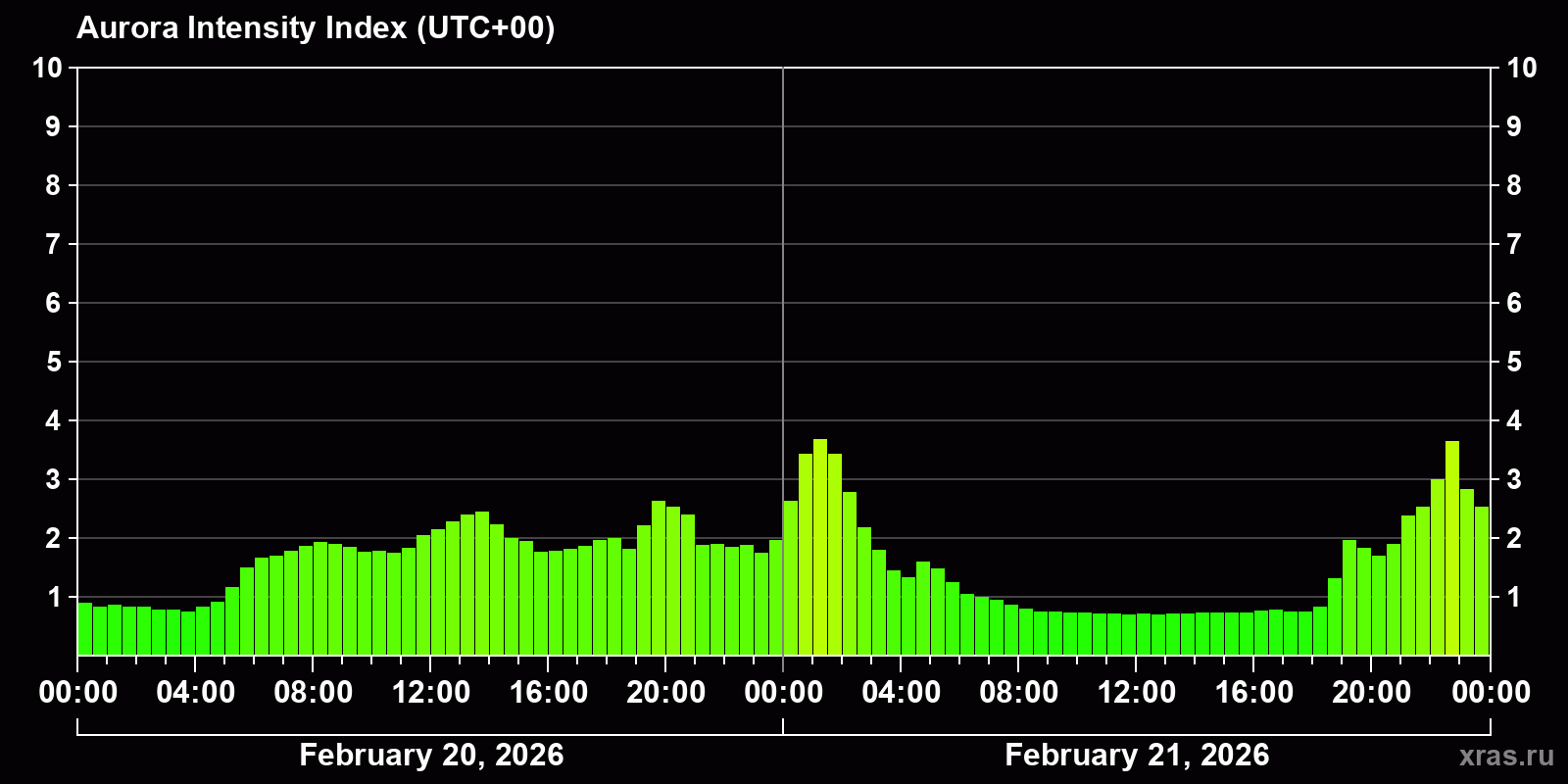 Auroral intensity index and the theoretically possible latitude of observations for nighttime in the Estern Hemisphere as of 2026-02-21 23:59 (end of day) local time
