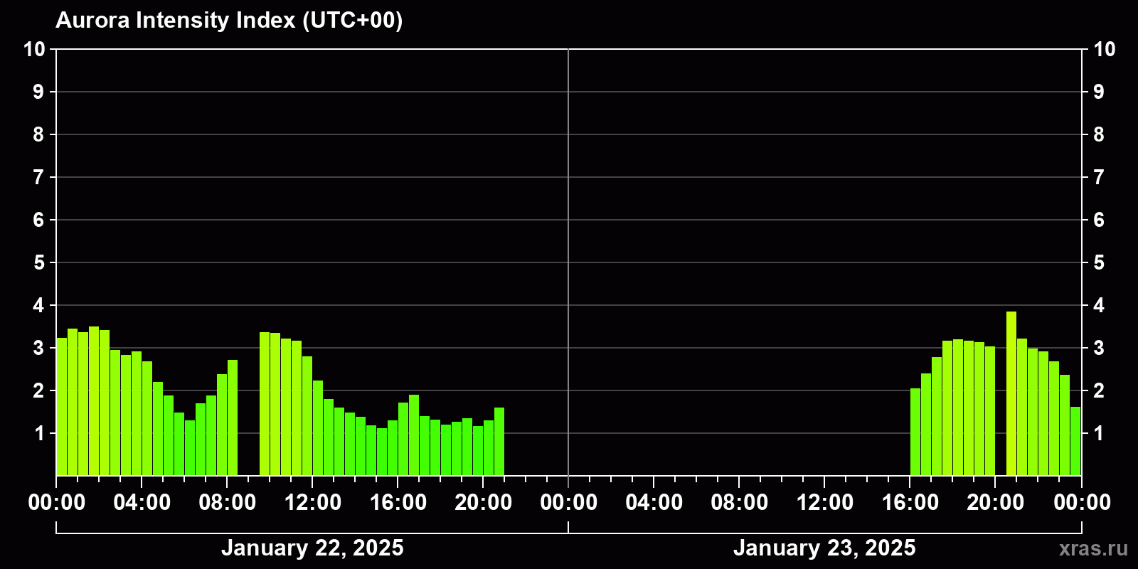 Auroral intensity index and the theoretically possible latitude of observations for nighttime in the Estern Hemisphere as of 2025-01-23 23:54 (end of day) local time