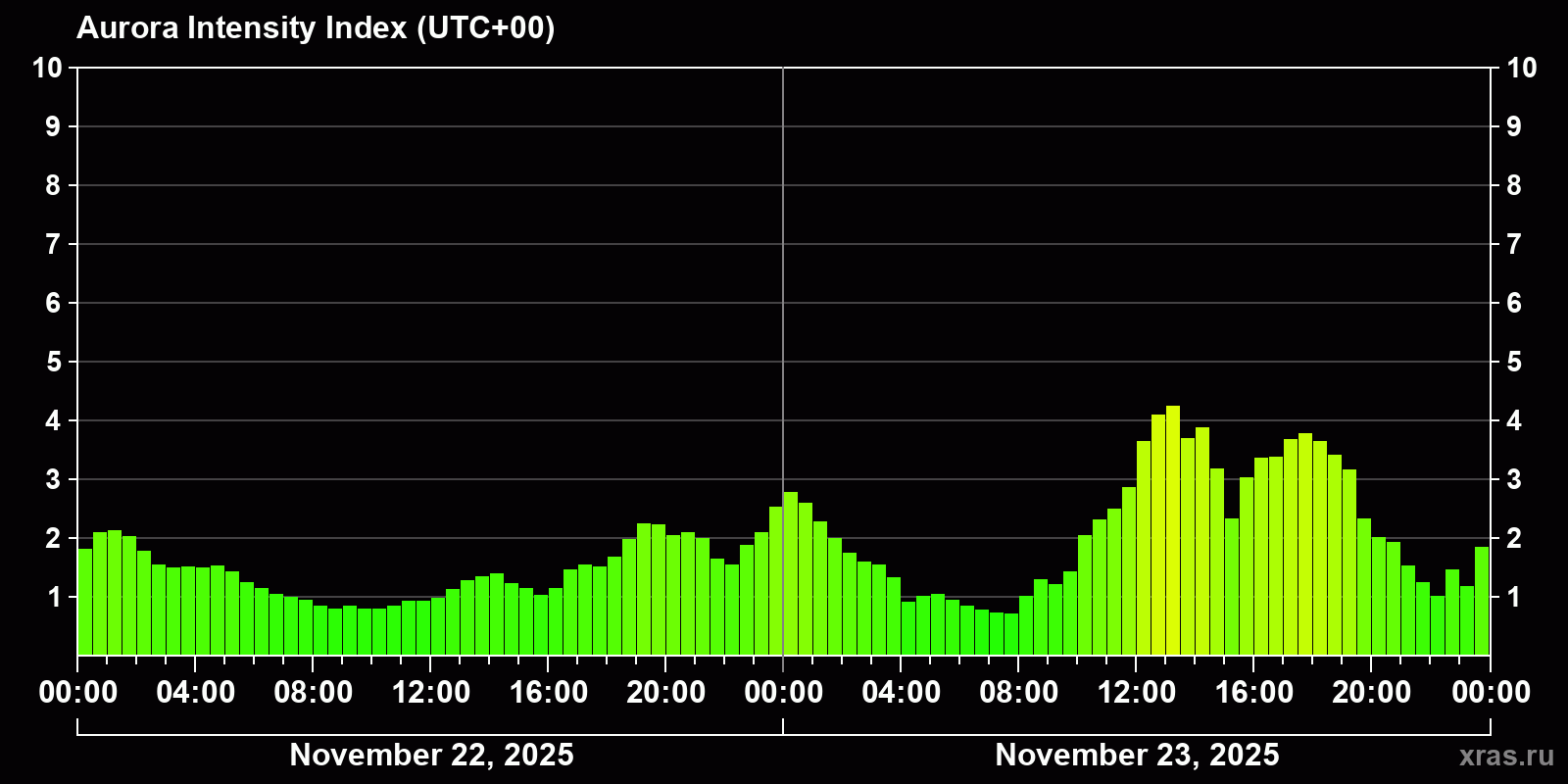 Changes in the auroral intensity index from 2025-11-22 to 2025-11-23 local time