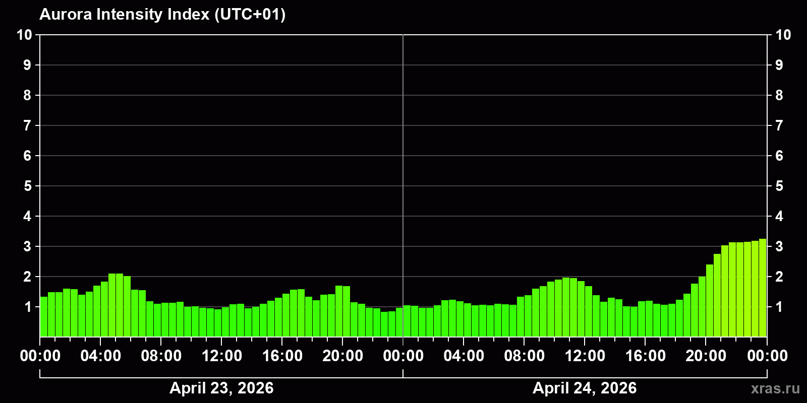 Changes in the auroral intensity index from 2026-04-23 to 2026-04-24 local time