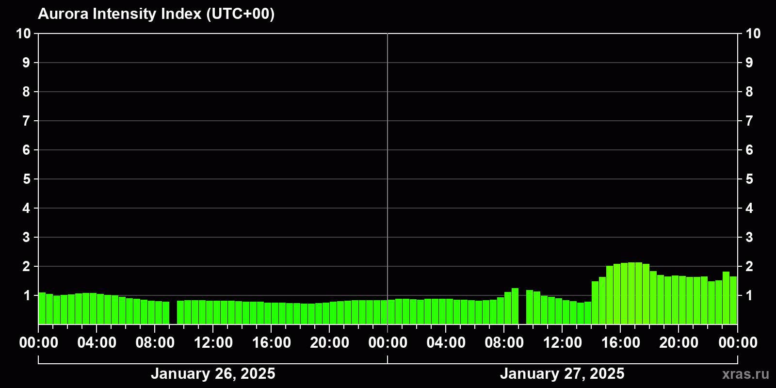Changes in the auroral intensity index from 2025-01-26 to 2025-01-27 local time