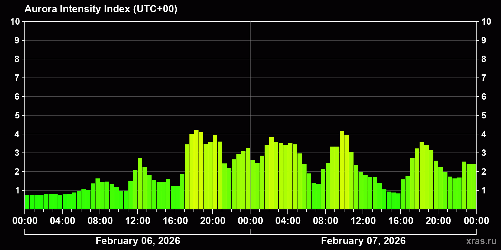 Auroral intensity index and the theoretically possible latitude of observations for nighttime in the Estern Hemisphere as of 2026-02-07 23:59 (end of day) local time