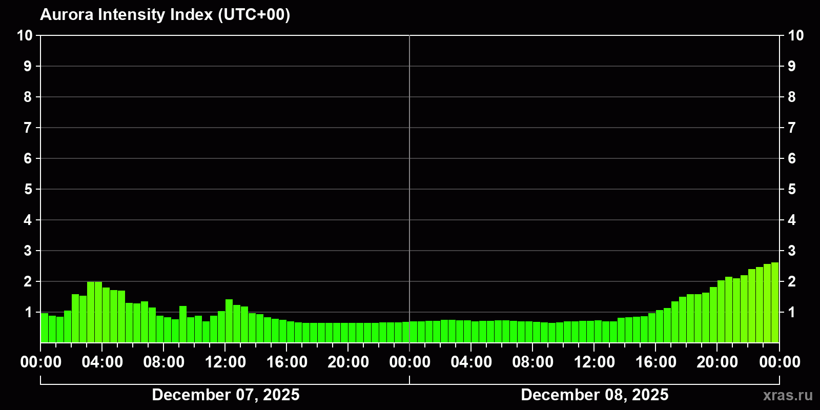 Auroral intensity index and the theoretically possible latitude of observations for nighttime in the Estern Hemisphere as of 2025-12-08 23:55 (end of day) local time