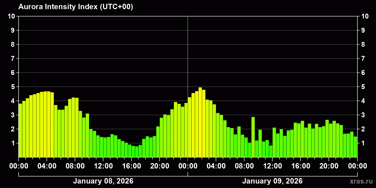 Auroral intensity index and the theoretically possible latitude of observations for nighttime in the Estern Hemisphere as of 2026-01-09 23:56 (end of day) local time