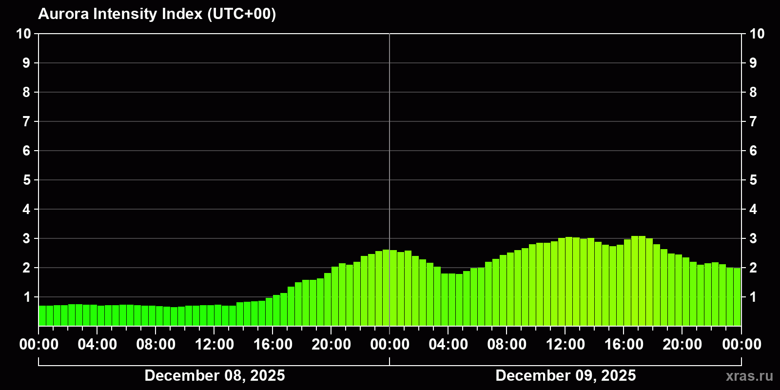 Auroral intensity index and the theoretically possible latitude of observations for nighttime in the Estern Hemisphere as of 2025-12-09 23:53 (end of day) local time