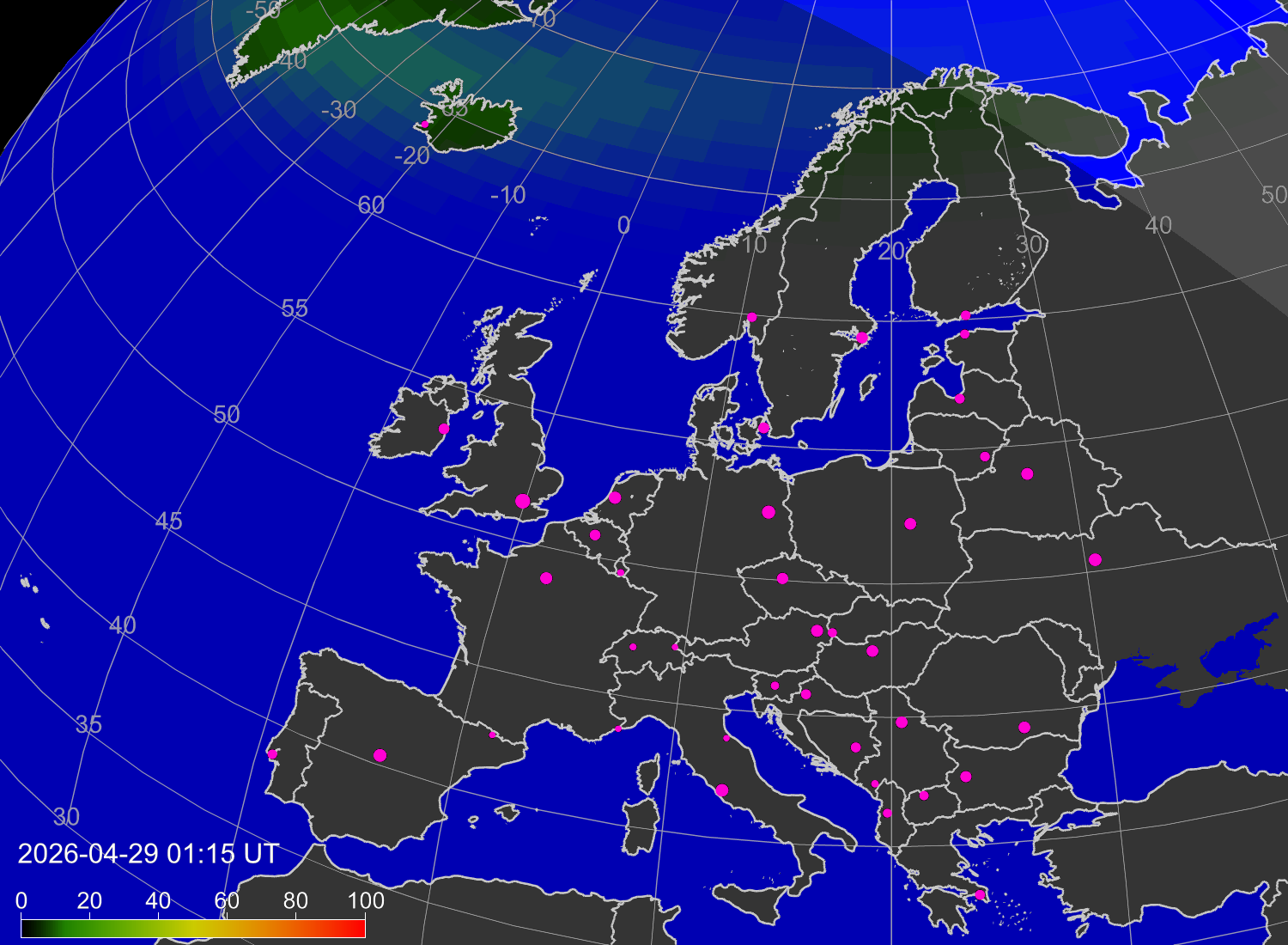 Auroral intensity index and theoretically possible latitude of observations for nighttime in the Estern Hemisphere