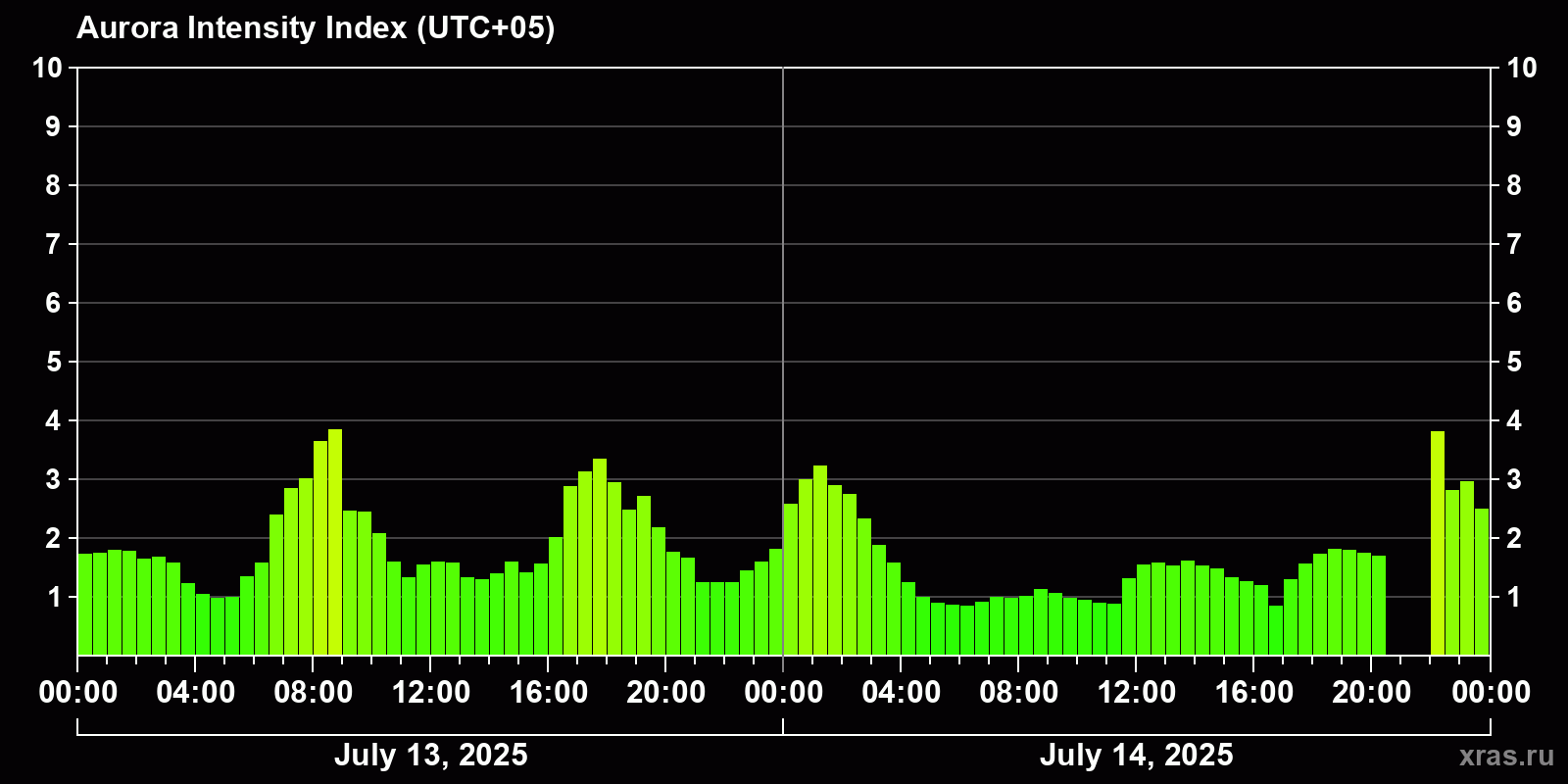 Changes in the auroral intensity index from 2025-07-13 to 2025-07-14 local time