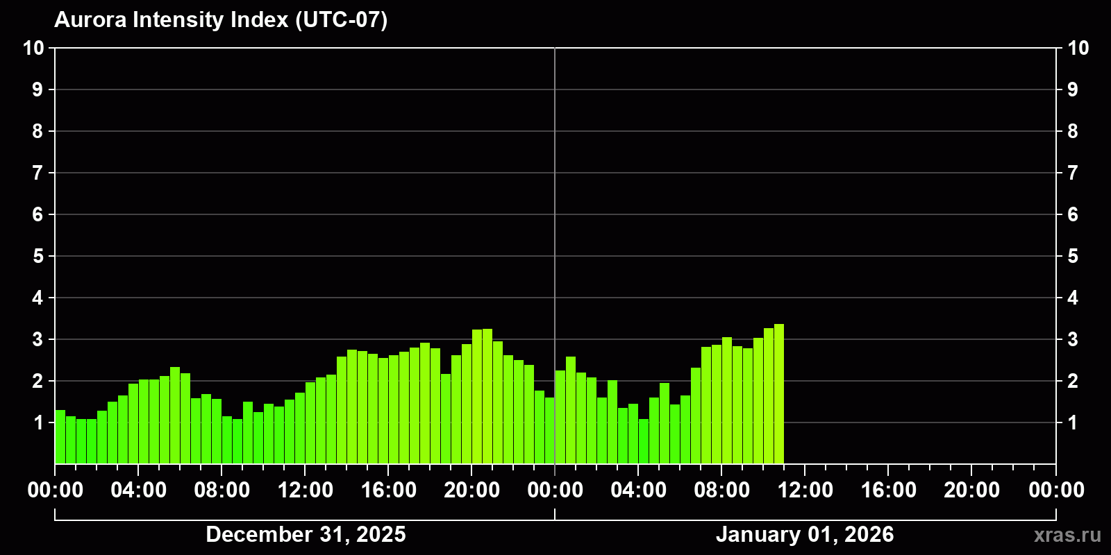 Auroral intensity index and the theoretically possible latitude of observations for nighttime in the Western Hemisphere as of 2026-01-01 08:52 (end of day) local time