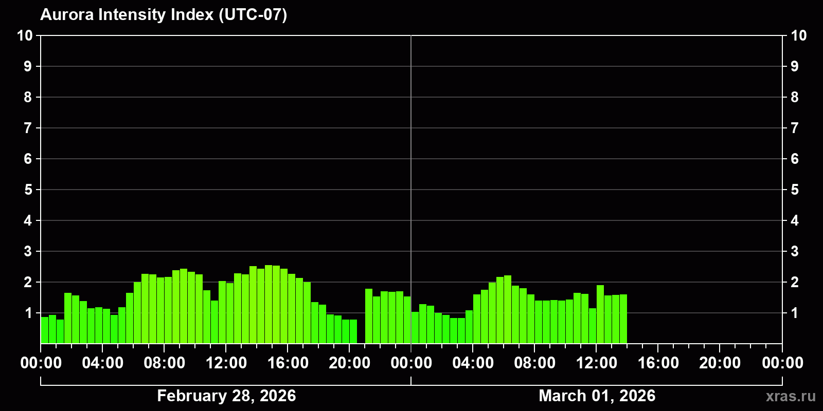 Changes in the auroral intensity index from 2026-02-28 to 2026-03-01 local time