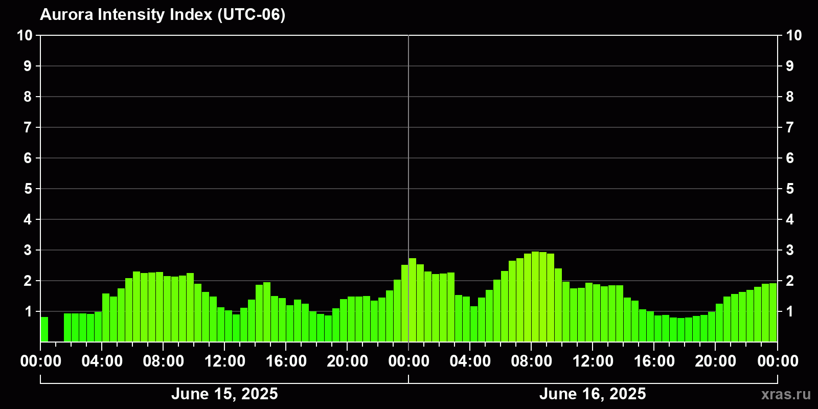 Auroral intensity index and the theoretically possible latitude of observations for nighttime in the Western Hemisphere as of 2025-06-16 23:58 (end of day) local time