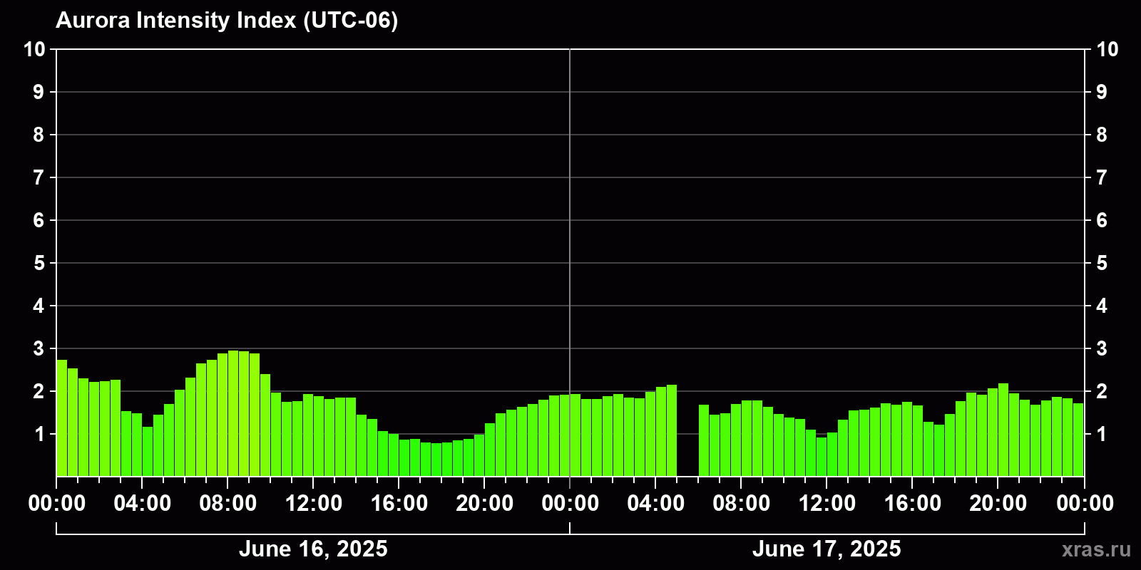 Auroral intensity index and the theoretically possible latitude of observations for nighttime in the Western Hemisphere as of 2025-06-17 23:48 (end of day) local time