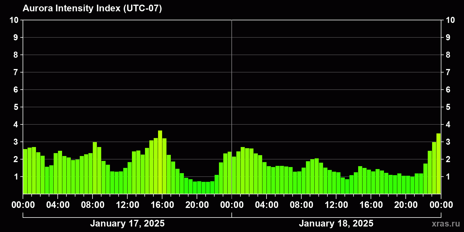 Auroral intensity index and the theoretically possible latitude of observations for nighttime in the Western Hemisphere as of 2025-01-18 23:57 (end of day) local time