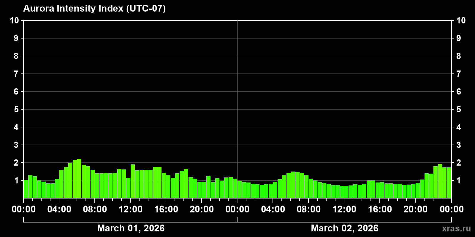 Changes in the auroral intensity index from 2026-03-01 to 2026-03-02 local time