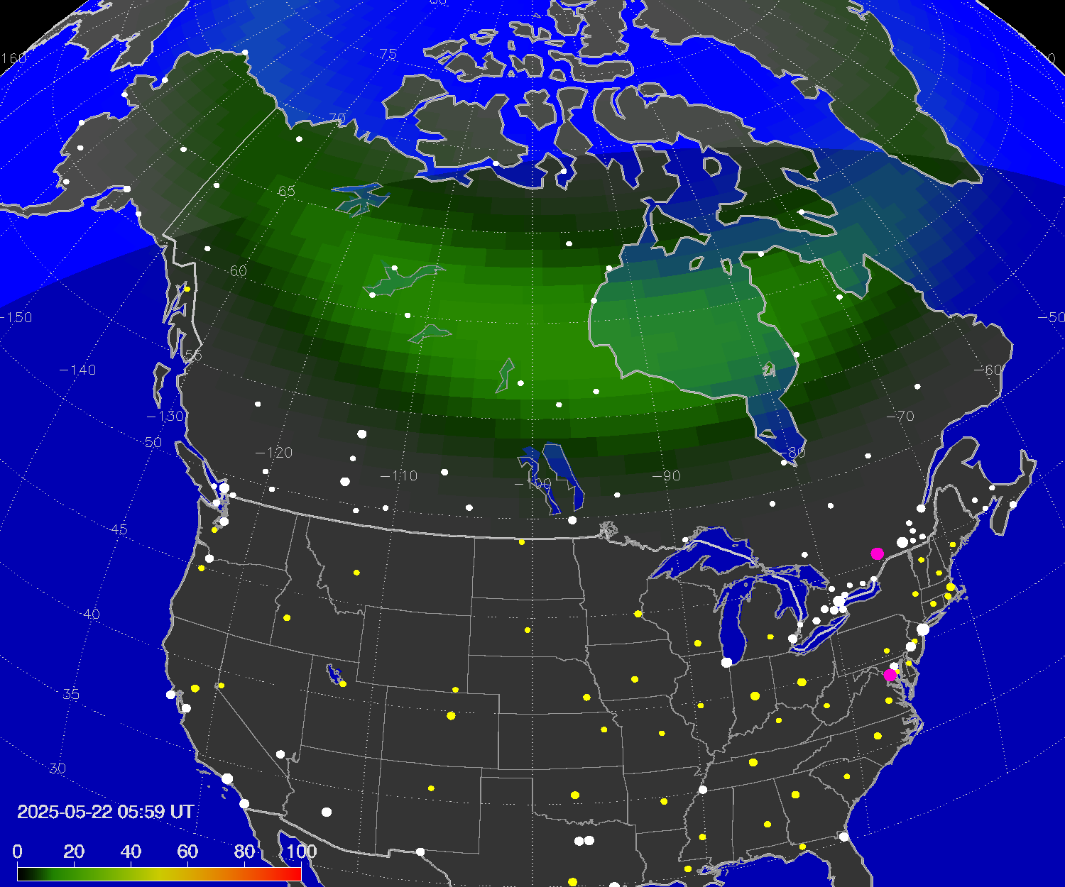 Auroral intensity index and the theoretically possible latitude of observations for nighttime in the Western Hemisphere as of 2025-05-21 23:59 (end of day) local time