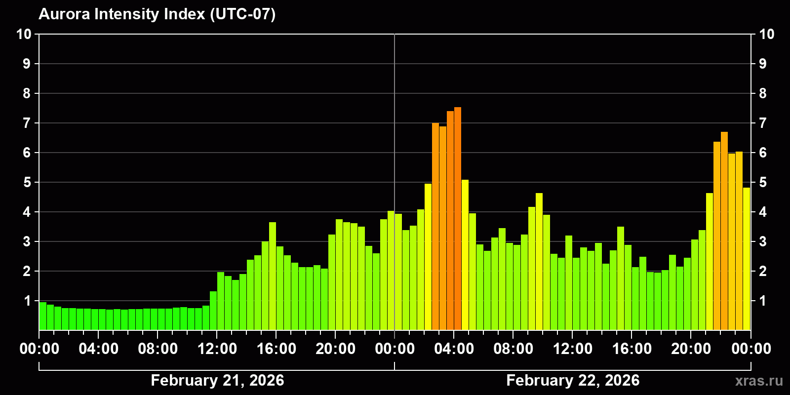 Auroral intensity index and the theoretically possible latitude of observations for nighttime in the Western Hemisphere as of 2026-02-22 23:46 (end of day) local time