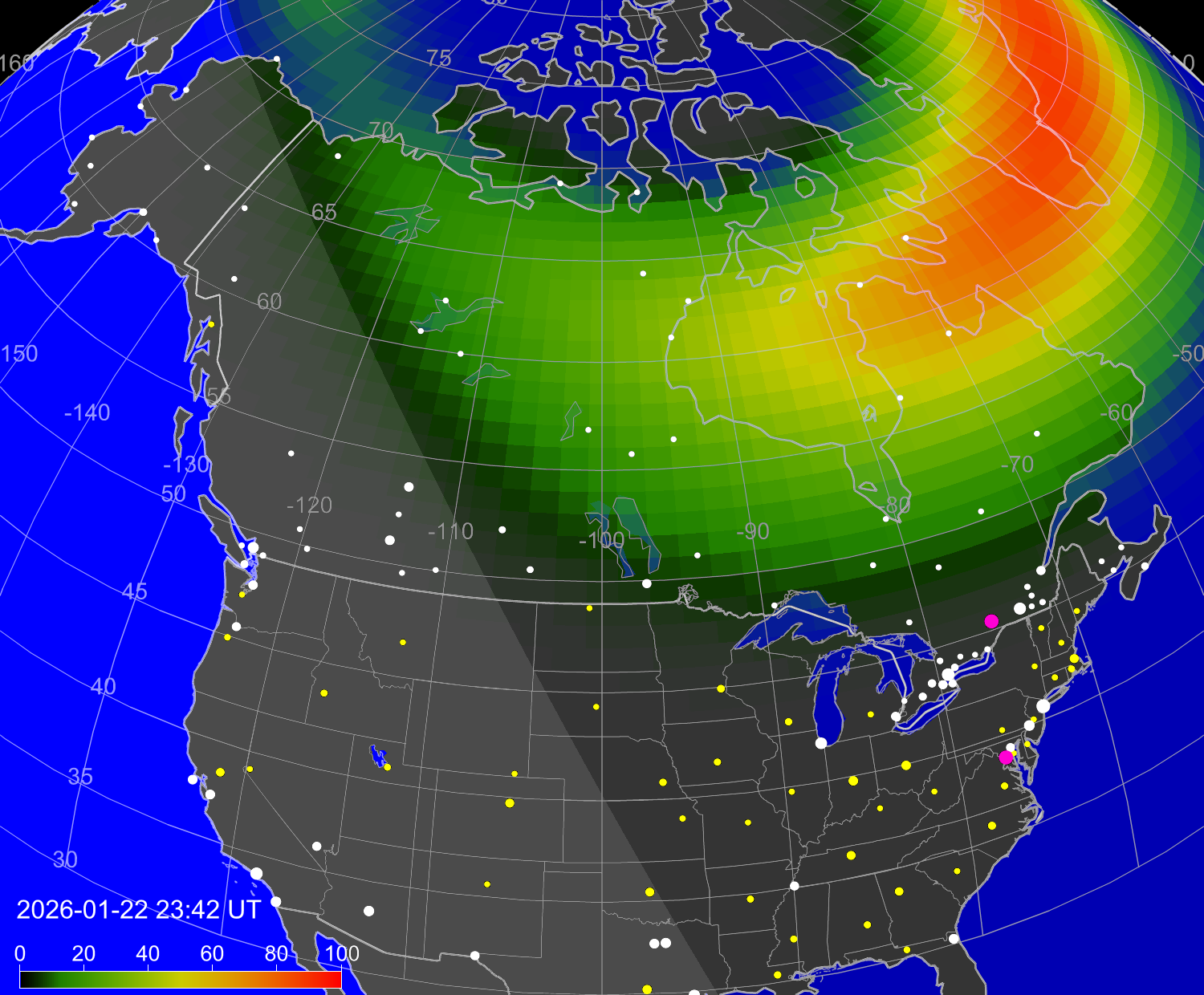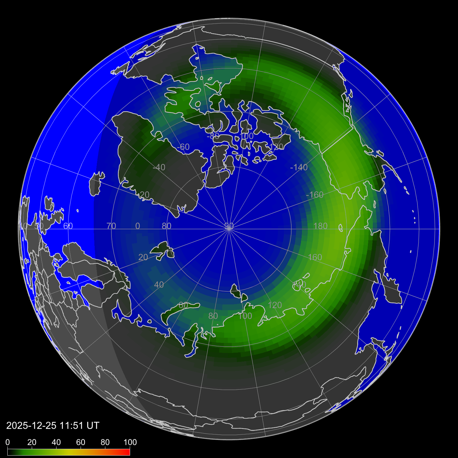 Индекс интенсивности полярных сияний и теоретически возможная широта наблюдений для ночного времени в западном полушарии