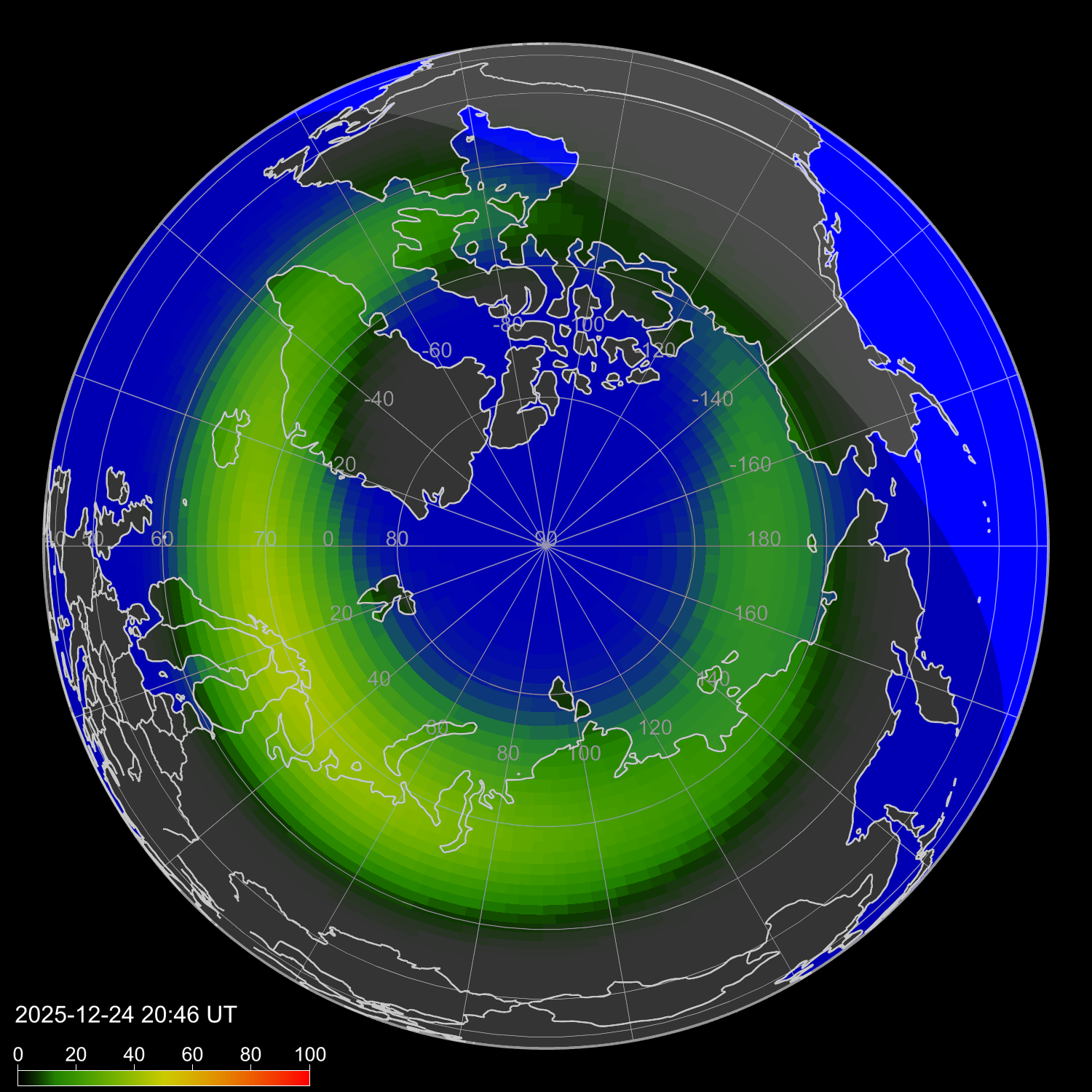 Изменения и часовой прогноз индекса интенсивности полярных сияний с 2025-12-23 по 2025-12-24
