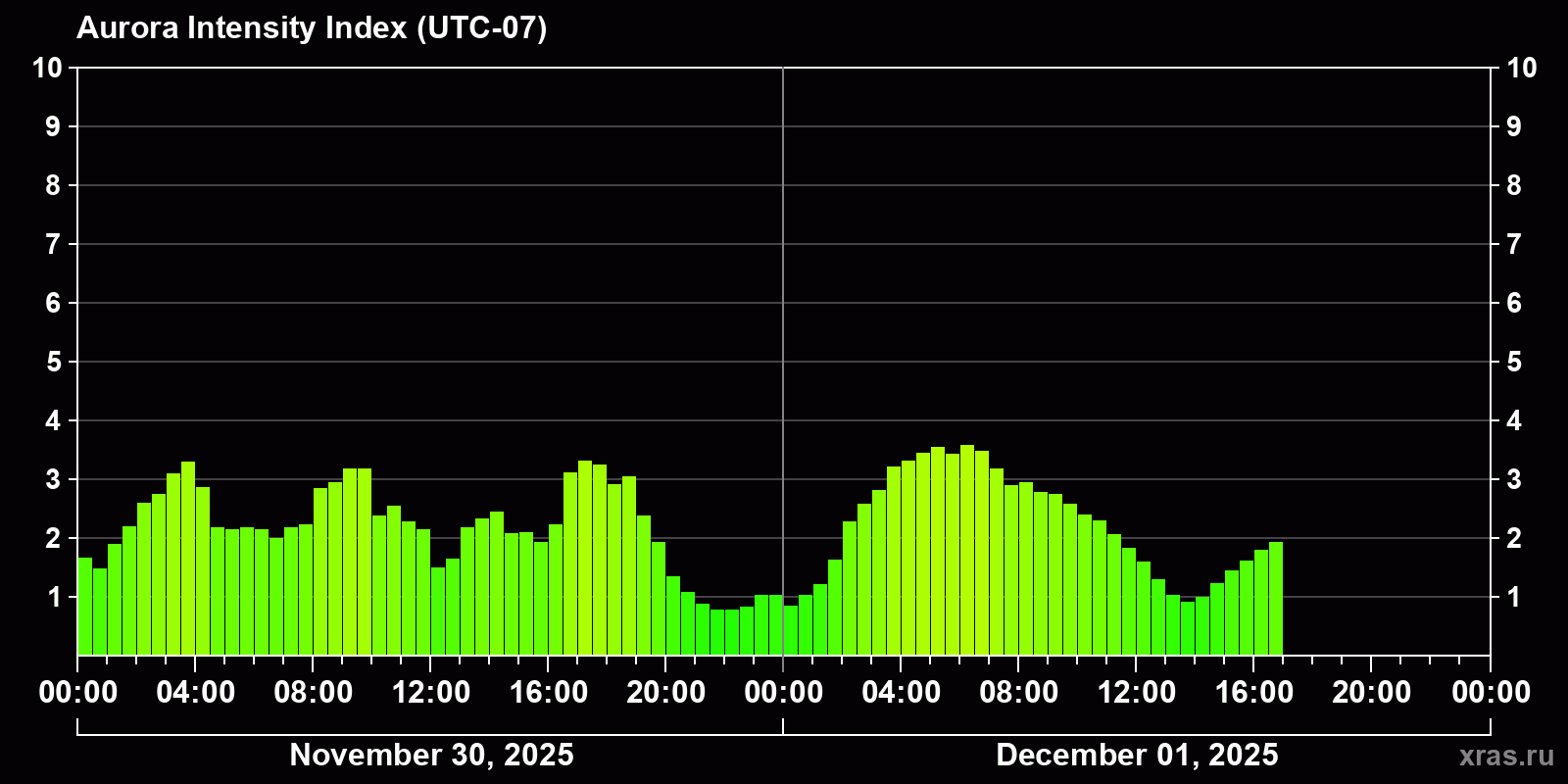 Auroral intensity index and the theoretically possible latitude of observations for nighttime in the Western Hemisphere as of 2025-12-01 09:06 (end of day) local time
