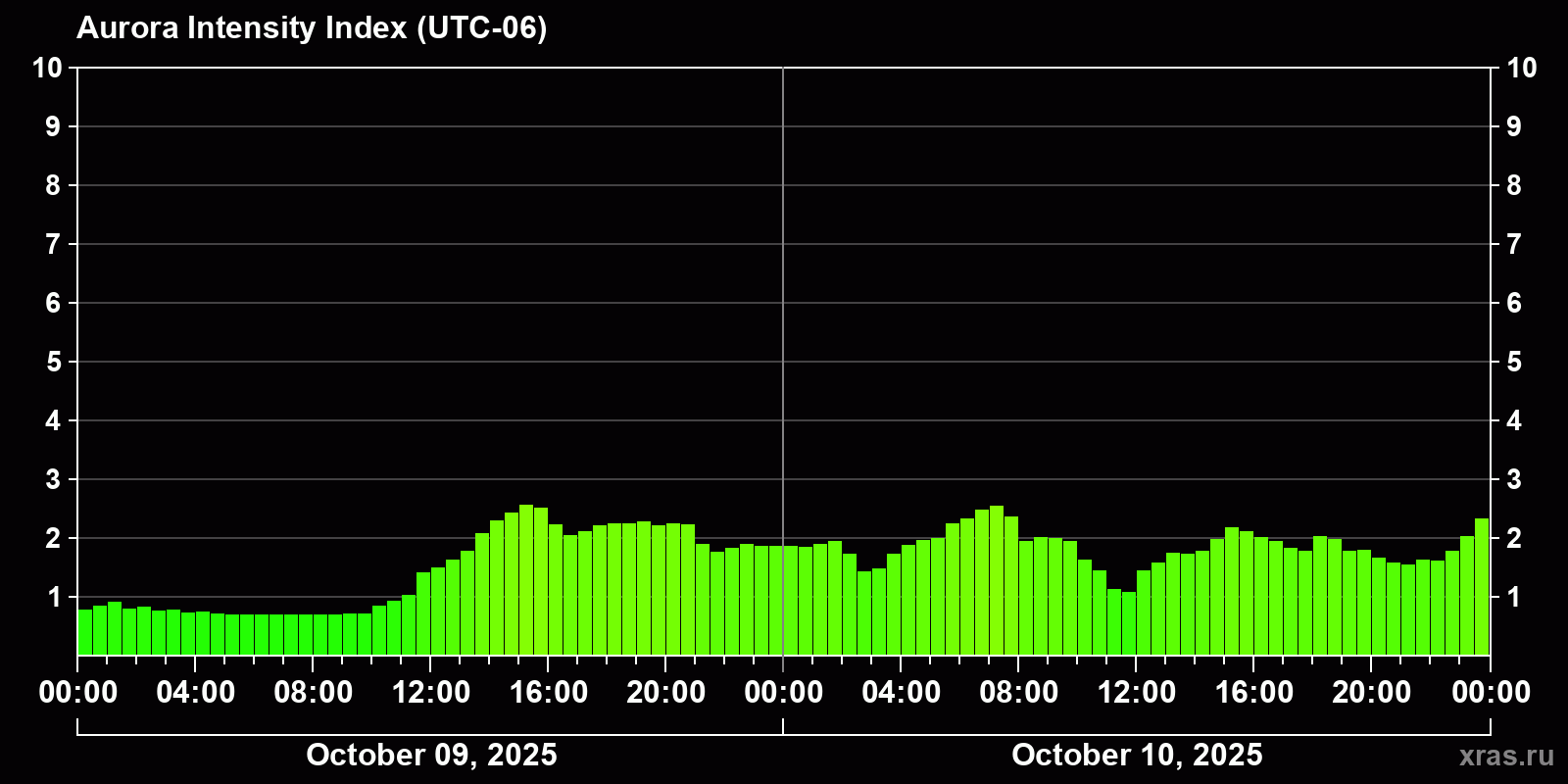 Auroral intensity index and the theoretically possible latitude of observations for nighttime in the Western Hemisphere as of 2025-10-10 23:48 (end of day) local time