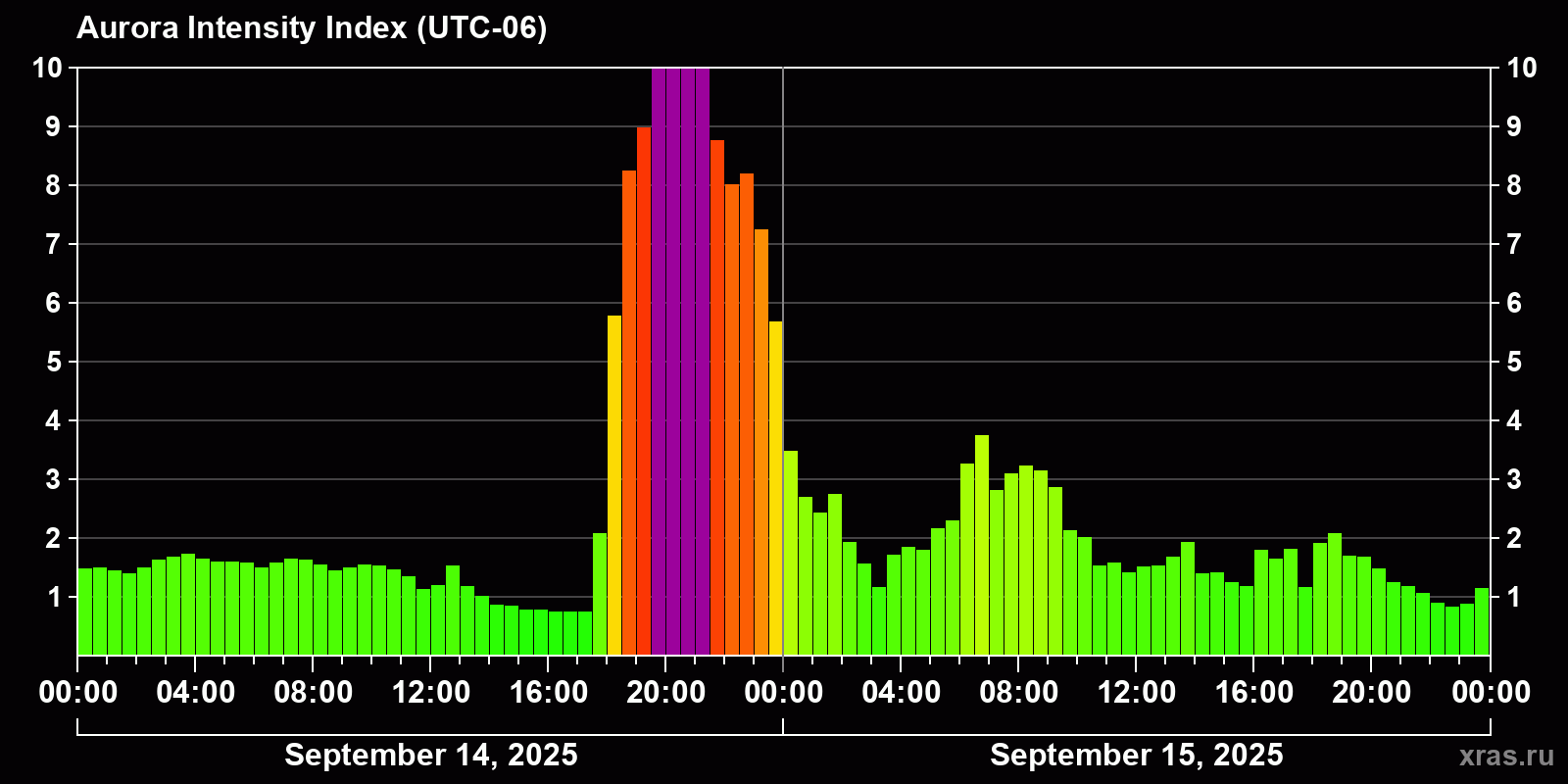 Changes in the auroral intensity index from 2025-09-14 to 2025-09-15 local time