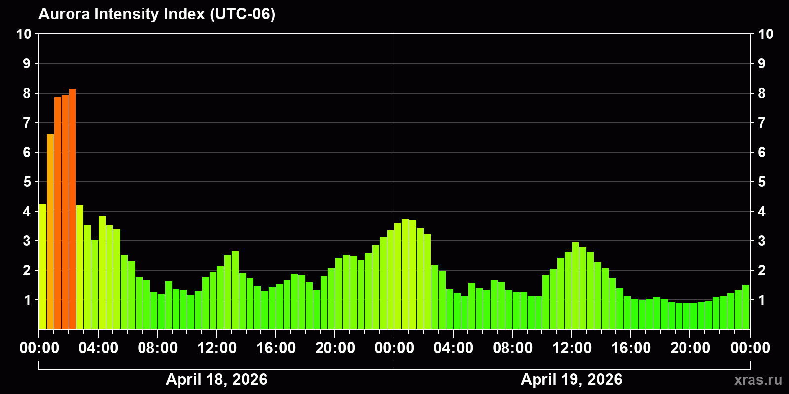 Changes in the auroral intensity index from 2026-04-18 to 2026-04-19 local time