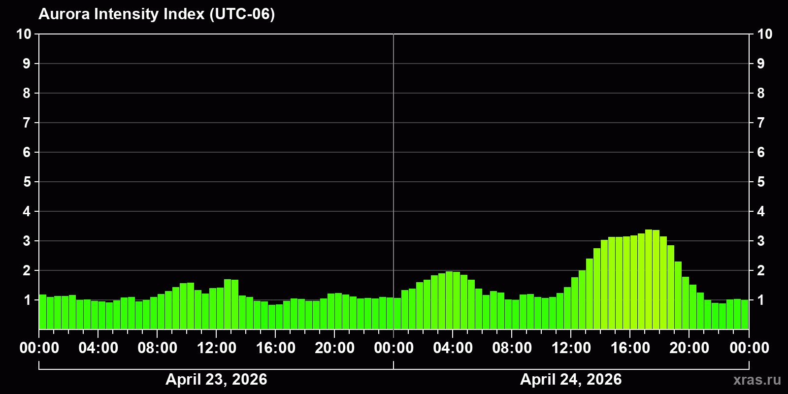 Changes in the auroral intensity index from 2026-04-23 to 2026-04-24 local time