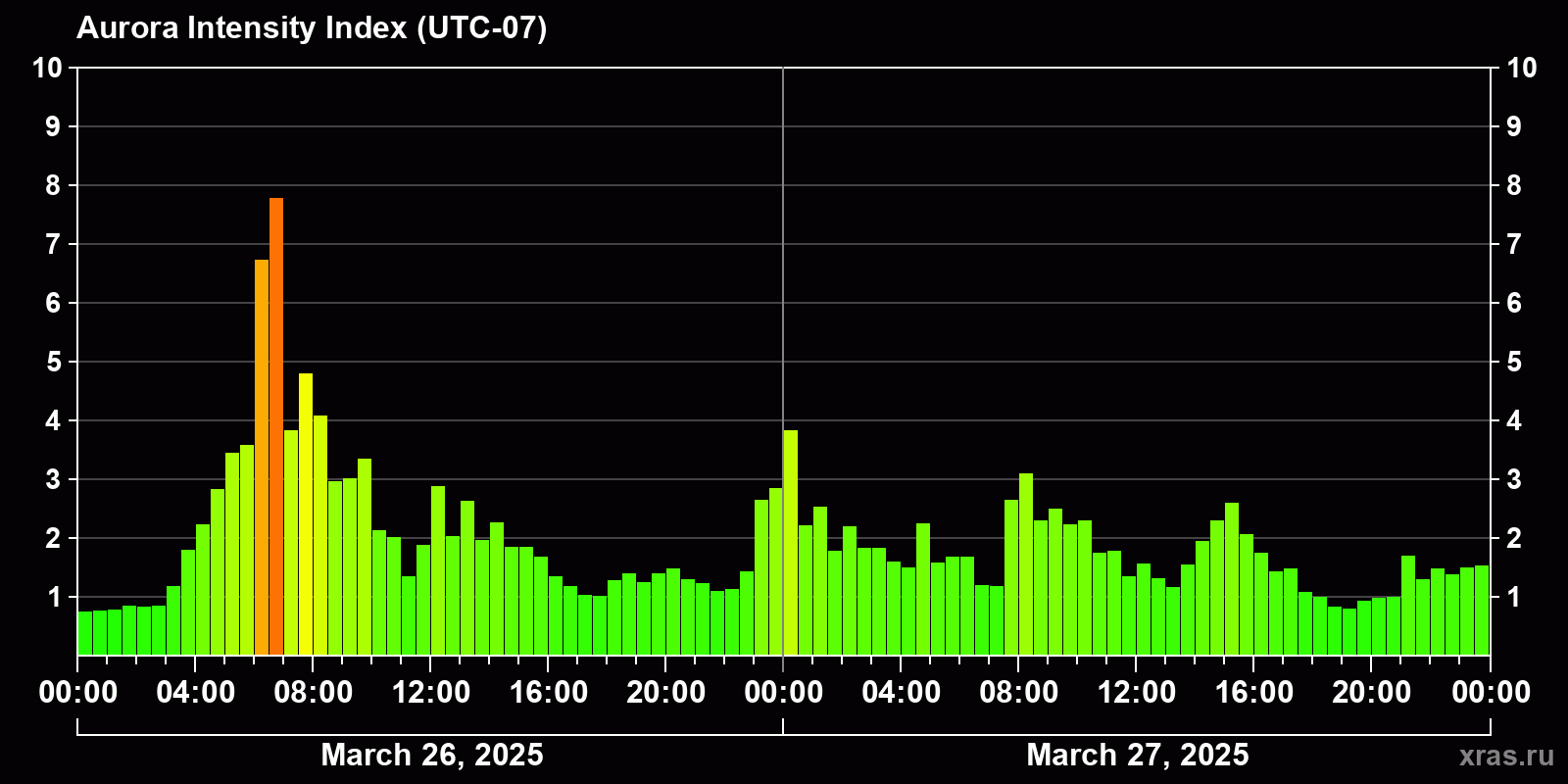 Changes in the auroral intensity index from 2025-03-26 to 2025-03-27 local time