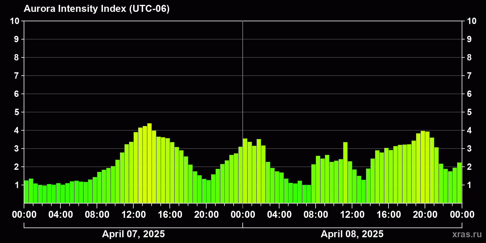 Changes in the auroral intensity index from 2025-04-07 to 2025-04-08 local time