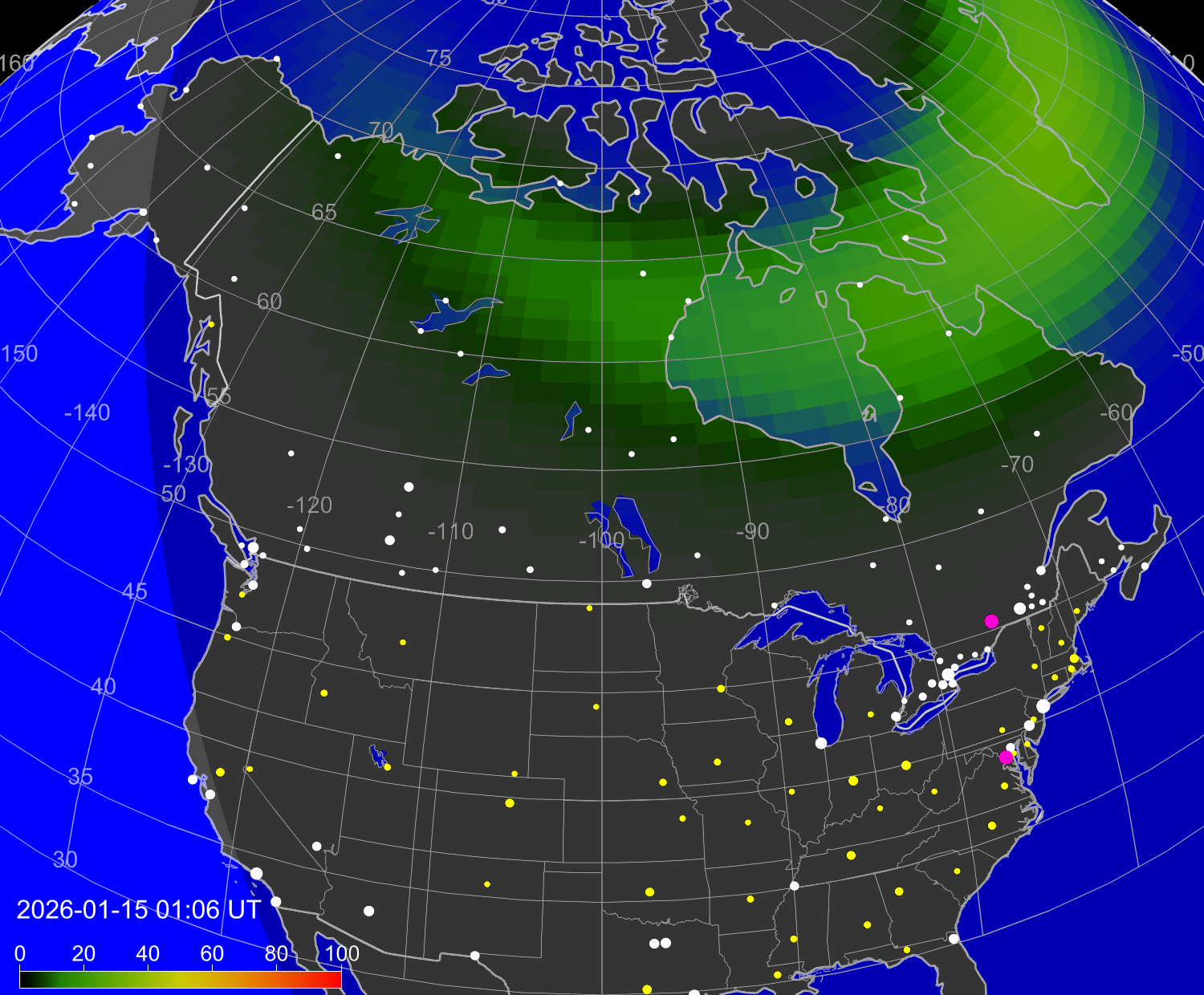 Изменения и часовой прогноз индекса интенсивности полярных сияний с 2026-01-13 по 2026-01-14