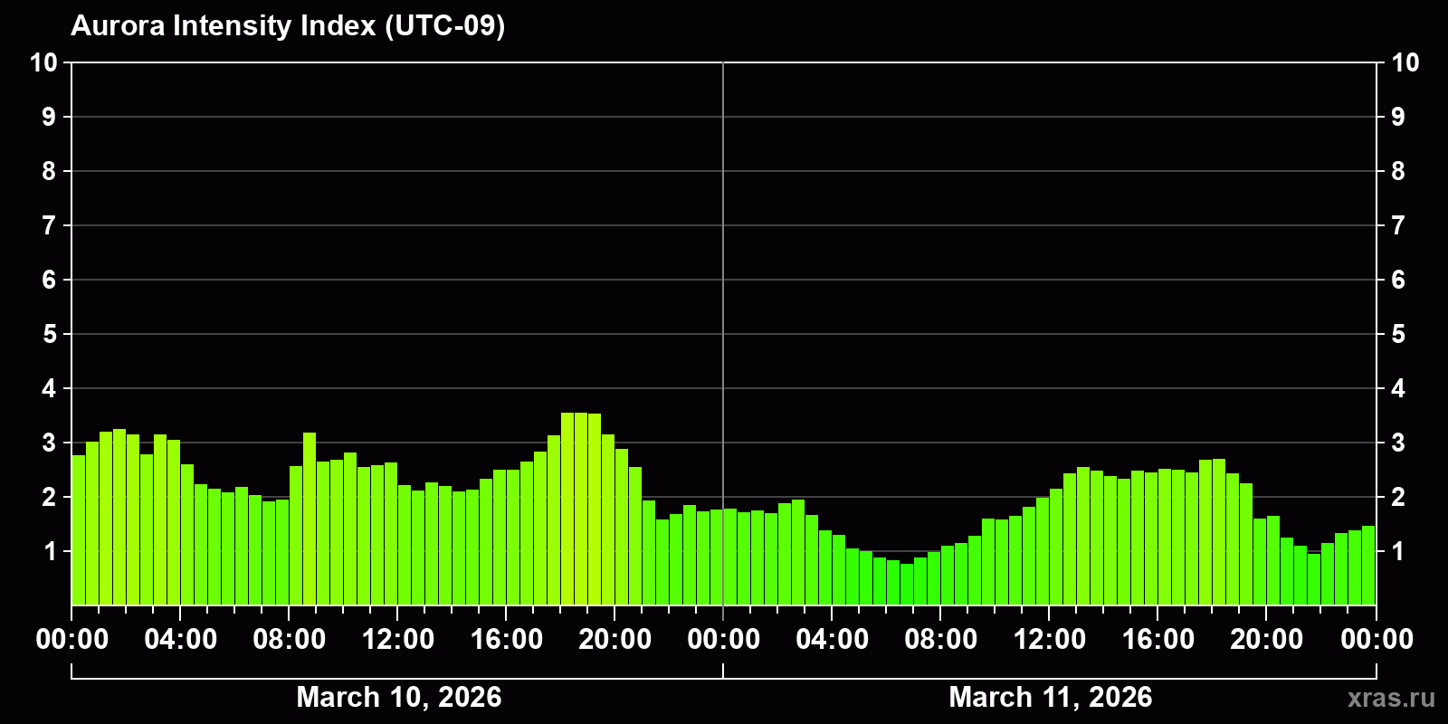 Changes in the auroral intensity index from 2026-03-10 to 2026-03-11 local time