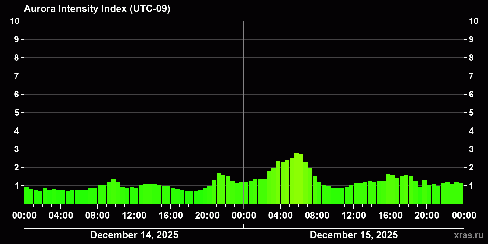 Changes in the auroral intensity index from 2025-12-14 to 2025-12-15 local time