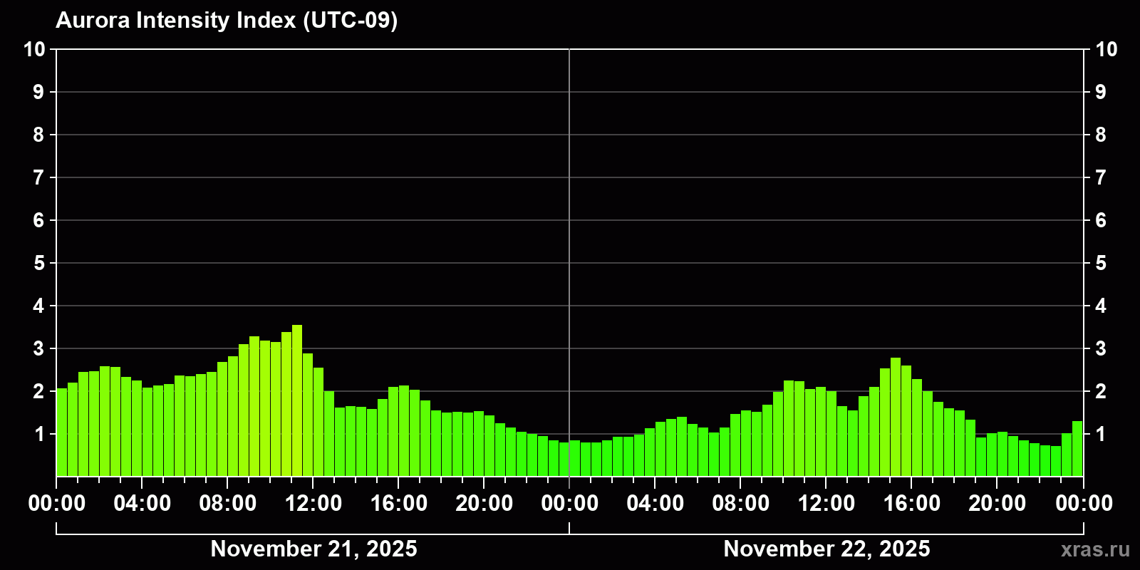 Changes in the auroral intensity index from 2025-11-21 to 2025-11-22 local time