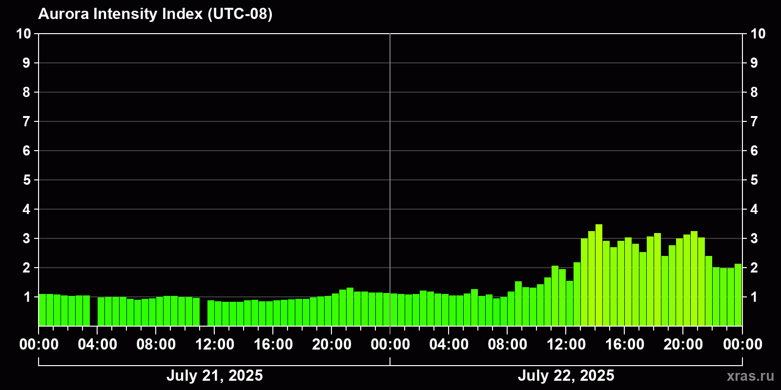 Changes in the auroral intensity index from 2025-07-21 to 2025-07-22 local time